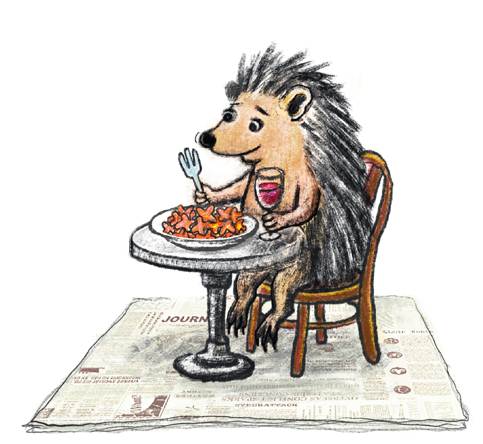 De volgende ochtend ren ik naar de tuin. Het voelt alsof ik mijn schoen heb gezet! Jammer genoeg is het bakje onaangeroerd. Niemand heeft ons een bezoek gebracht in de donk’re nacht. Ik laat de brokjes staan en besteed de ochtend aan het toegankelijker maken van de tuin. Egels houden van rommelig, dat heb ik alvast in de pocket. Ik hark de bladeren op een weldadige hoop en zet een schaaltje water neer. Ik knip gaas weg, ruim de mini-vijver op, zodat er geen langverwachte gasten in verdrinken, en maak poortjes naar de buurtuin, waardoor het restaurant via meerdere wegen te bereiken is. De volgende ochtend zijn de brokjes ver- dwenen, het schaaltje is leeg! Ook zijn er pootafdrukken te zien. Van katten welteverstaan. Welke Houdini heeft dit voor elkaar gekregen? Grmbl, op naar de bouwmarkt dan maar, voor twee pvc- buizen.