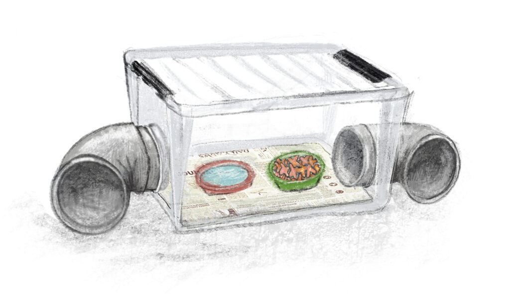 Bij nadere inspectie is juichen misschien overdreven, want het is niet bepaald mooi. Het egelrestaurant bestaat uit een doorzichtige kunststof opbergbox met twee uitstekende pvc-buizen. In een grote tuin kun je zo’n gevaarte wegmoffelen achter een struik, maar in mijn stadstuintje is dat een stuk lastiger. Maar goed, alles voor de egel, mensen! Allereerst die box. Plastic nieuw aanschaffen kan ik niet over mijn hart verkrijgen. Daarom ga ik op zoek naar een tweedehandse. Hoe moeilijk kan het zijn? De kringloopwinkel staat vol met plastic meuk, toch? Klopt, maar niet in de vorm die ik nodig heb. Ik bezoek elke tweedehandswinkel in de stad, maar er staan nul toekomstige egelrestaurants te koop. Hetzelfde geldt voor Marktplaats-advertenties in de buurt. Pas als ik mijn vraag in een paar buurtapps heb gegooid, komt er een geschikt exemplaar bovendrijven.