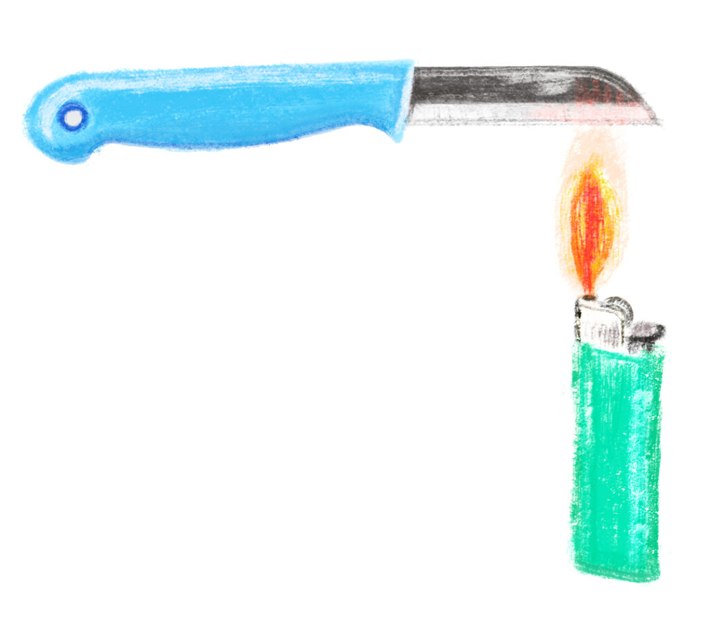 Nu volgt stap twee: een in- en uitgang maken door een rondje uit de box te snijden of branden. In die twee openingen komen de pvc-buizen. Hiervoor heb ik een buis met een hoek nodig. Zo kunnen katten zich er niet toch doorheen wurmen. Hmm, ik maak eerst maar eens één gat en kijk daarna of ik niet een leukere oplossing weet. Het uitsnijden van kunststof doe je, zo lees ik, met een soldeerbout of graveerpen, die ik allebei niet heb. Maar een scherp mes dat verhit is, doet de truc ook. Ik pak een kaars en een schilmes en maak met een stift een omtrek. Dertien centimeter is wat een egel minstens nodig heeft om een soepele entree te maken. Ik houd mijn mes in de kaars en maak de eerste inkeping. Erg snel gaat het niet. Bovendien walmen er dampen die ongetwijfeld kwalijk zijn mijn neusgaten binnen. Ik neem me voor om dit de volgende keer overdag te doen, zodat ik naar buiten kan. Met de deur wagenwijd open steek ik in een kwartier een opening uit. De randjes zijn niet strak, die werk ik af met tape.