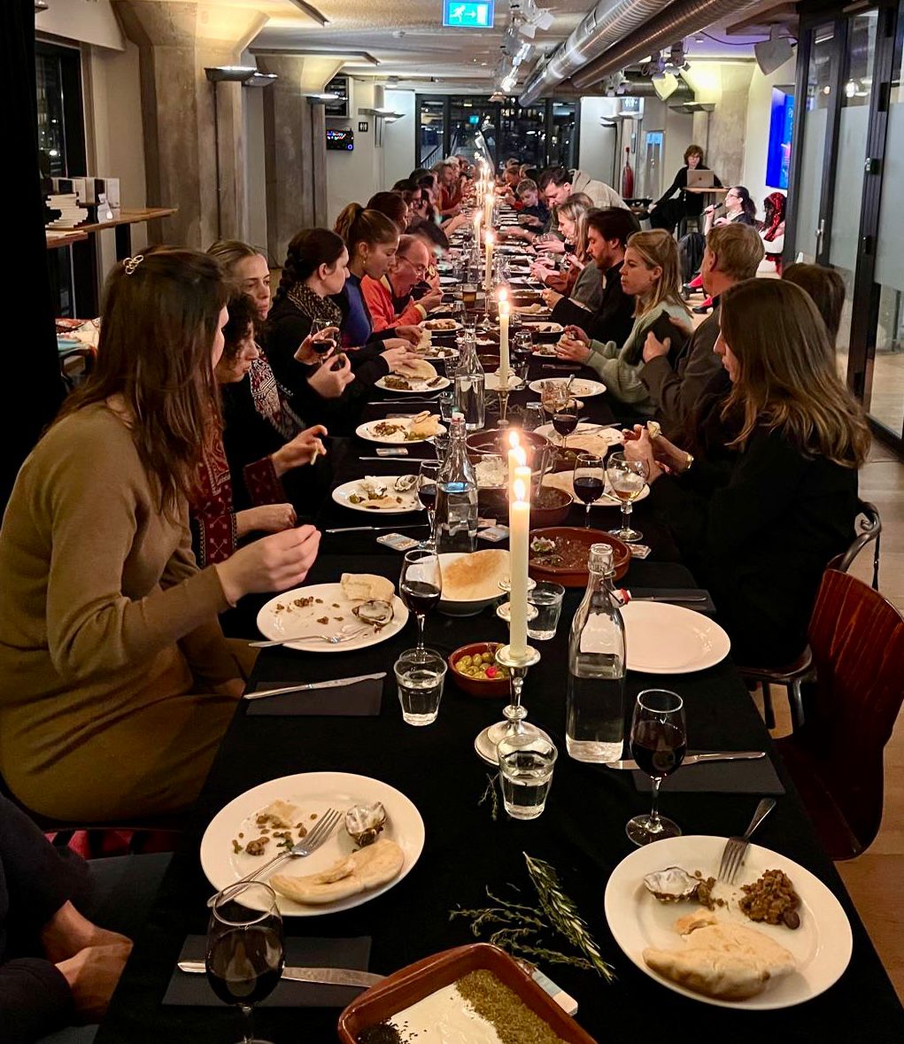 In het Amsterdamse debatcentrum Pakhuis de Zwijger is een week voor kerst een lange tafel gedekt. Zo’n vijftig mensen schuiven aan voor een Palestijns kerstdiner. Aanleiding is de verschijning van het kook- en geschiedenisboek Een Palestijns diner van schrijfster Umayya Abu-Hanna en vormgeefster Mary Ann Jaraisy: “Een boek gevuld met leven, geschiedenis, recepten en liefde.” Beide vrouwen zijn bovendien mede-oprichters van The Hummus Academy, om “hummus te eren als cultureel erfgoed dat mensen bij elkaar brengt” en “te bouwen aan een meer verantwoorde, ethische en heerlijke toekomst voor de planeet en alle levende wezens”. Palestina heeft zoveel moois te bieden, volgens Umayya, “maar dat wordt verborgen onder lagen puin, trauma en doden. We wilden licht laten schijnen op de lange culinaire geschiedenis van het land.”