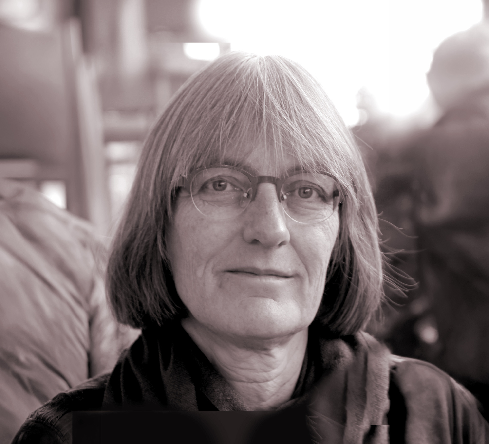 Wendela de Vries kijkt recht de camera in. De foto is een portret in grijstinten. Ze heeft half lang haar met een pony en draagt een bril.