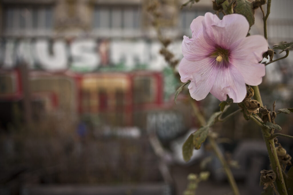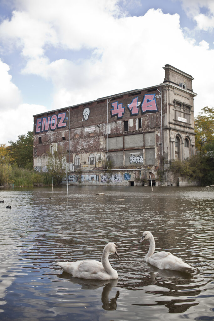 Het pad loopt om de vijver heen, langs een spoorbedding met zijn immer veranderend canvas aan graffiti. Het riet en de wilgen zijn behoorlijk hoog opgeschoten. Iets verderop, in de schaduw van het museum, staan een paar rijen houten bakken, bedoeld als volkstuintjes. Veel groeit er niet meer in deze tijd van het jaar, alleen wat pompoenen, kruiden en spruitjes.