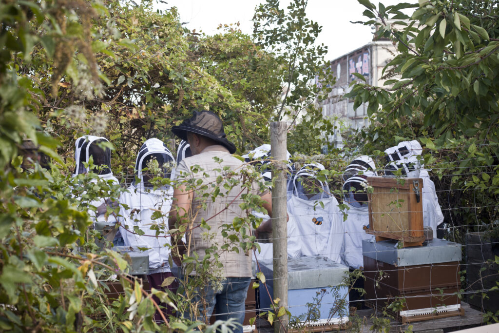 Een pad net naast de voormalige brouwerij Métropole, statig maar vervallen, leidt naar het terrein. Hier, ingeklemd tussen de Van Volxemlaan en de treinsporen, ligt het Marais Wiels, een van de interessantste groene plekken van de stad. Ondanks het vroege uur is er al volk. Enkele thuislozen hebben er de nacht doorgebracht in hun tentjes. Een groep schoolkinderen krijgt uitleg van een imker over bijen. Even later mogen ze in de korven kijken, elk gekleed in een imkerpak, net kleine ruimtevaarders.
