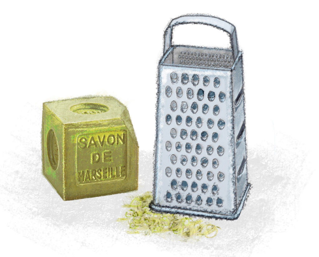 Marseillezeep is te koop zonder jasje eromheen. Geen papier, geen plastic, alleen een groen blok ongeveer zo groot als een Rubiks kubus. De zeep bestaat grotendeels uit olijfolie en wordt volgens de overlevering al sinds de veertiende eeuw in Marseille gemaakt. Kijk, dat schept vertrouwen. Recepten om wasmiddel te maken van Marseillezeep zijn niet moeilijk te vinden of te volgen. Het lastigste is kiezen welke verhouding ik aanhoud, want daarin verschillen de instructies die ik online vind. De een zegt dat 75 gram voor 5 liter genoeg is, de ander gebruikt 40 tot 100 gram per liter. Ik besluit 40 gram zeep te raspen en die in 2 liter kokend water op te lossen. Na een nachtje afkoelen en (een beetje) indikken is mijn wasmiddel klaar voor gebruik!