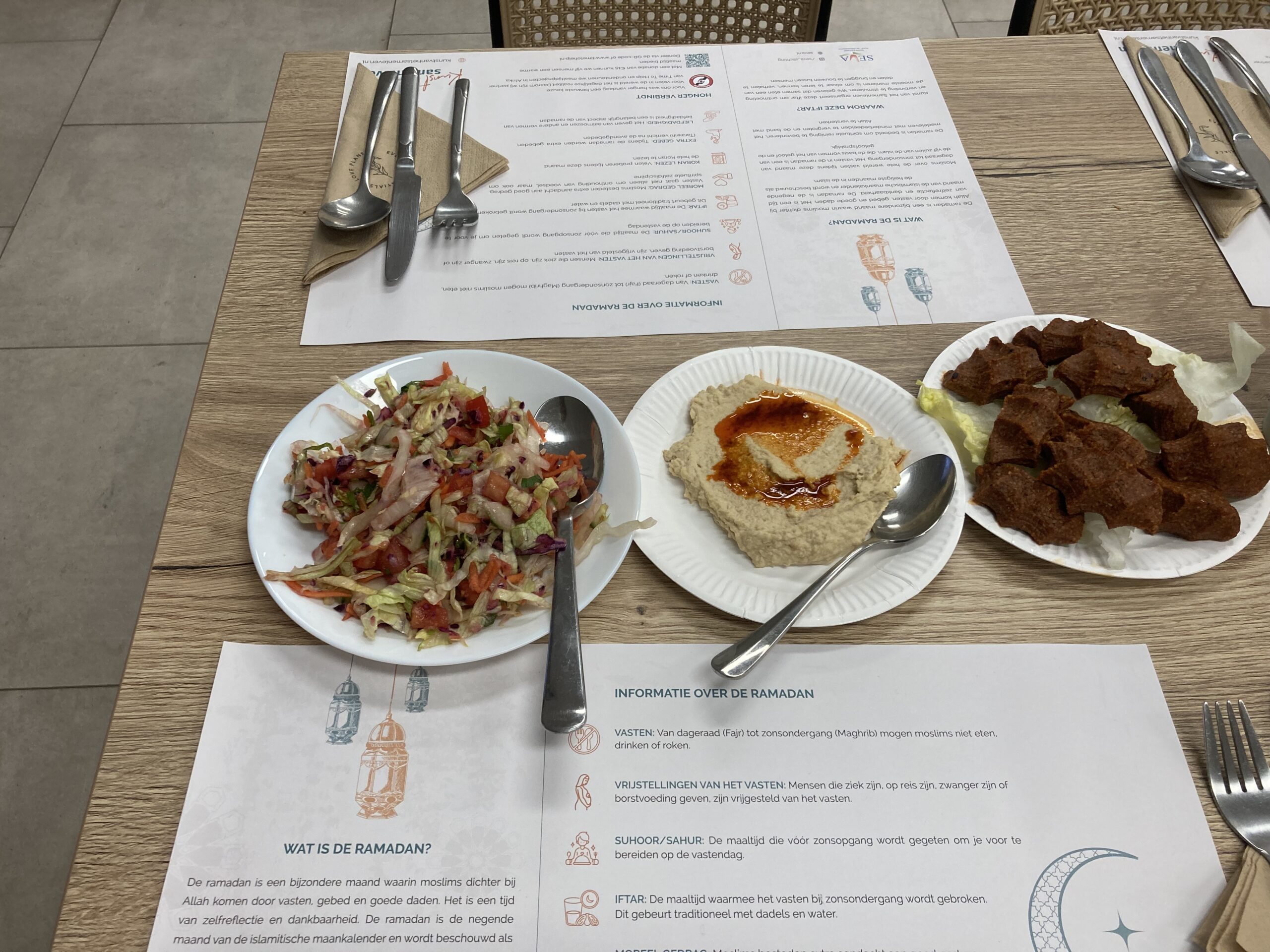 Jongeren in witte hesjes van de islamitische ontwikkelingsorganisatie Time to Help dekken de tafels en wijzen gasten hun plek. Op de tafels staan alvast schaaltjes met salade, humus, chi-köfte (gemaakt van bulgur) en dadels: daarmee zou de profeet Mohammed het vasten traditiegetrouw hebben gebroken. Ter verwelkoming wijst Semahat de eters op het Iftar-mee-programma, waarvoor iedereen ongeacht levensbeschouwing zich kan opgeven.“Dan ga je ergens thuis bij een iftar-kok eten, die dan van tevoren niet weet wie hij of zij als gast kan verwachten.” Heel leuk, weet ze uit eigen ervaring. Een imam reciteert een tekst in het Arabisch, afgesloten met ‘Eet smakelijk’. We krijgen eerst linzensoep en als hoofdgerecht rijst met geroosterde groenten. “Ik denk dat de veganistische maaltijd voor sommigen even schakelen is”, zegt tafelgenoot Ömer Gürlesin. “Mensen voor iftar uitnodigen betekent gastvrij zijn, dus flink uitpakken en vaak dan juist vlees serveren.”